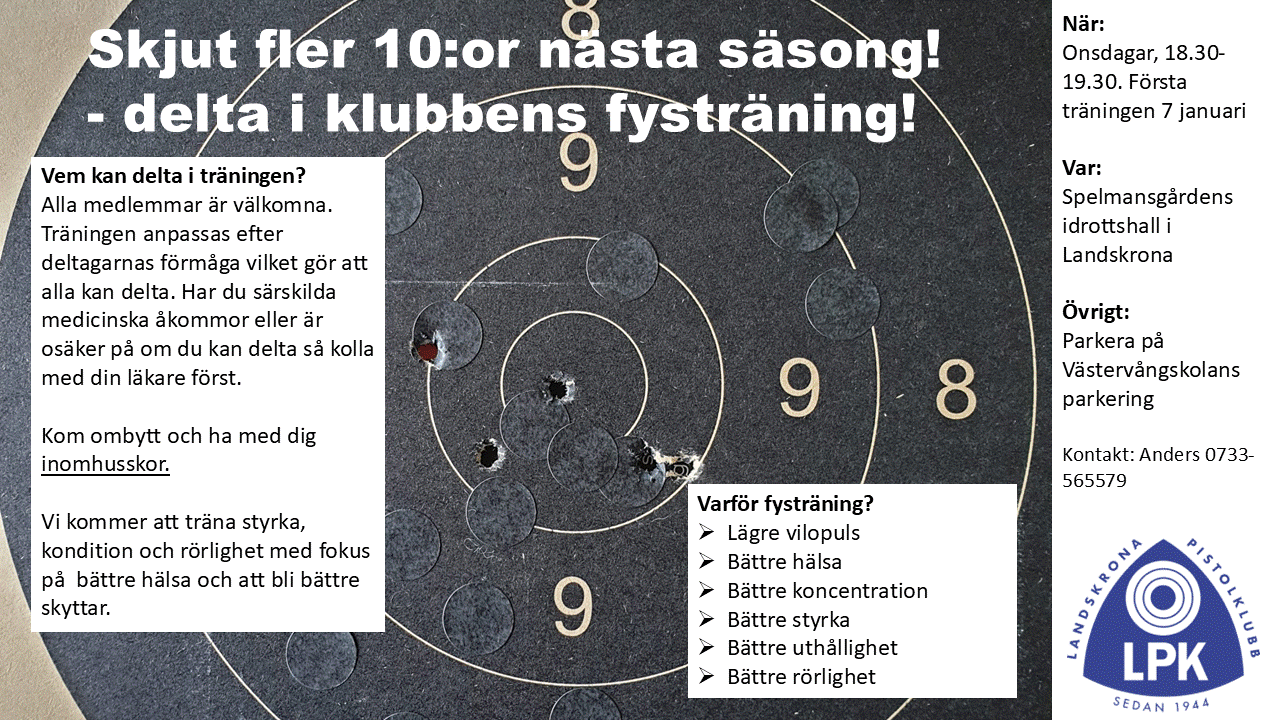 Alla medlemmar bjuds in till fysträning på egen nivå. Vet inte så mycket mer om det än det vi ser i inbjudan men finns det någon i klubben som vet vad som behövs för ett bättre skytte så är den mycket välkommen.